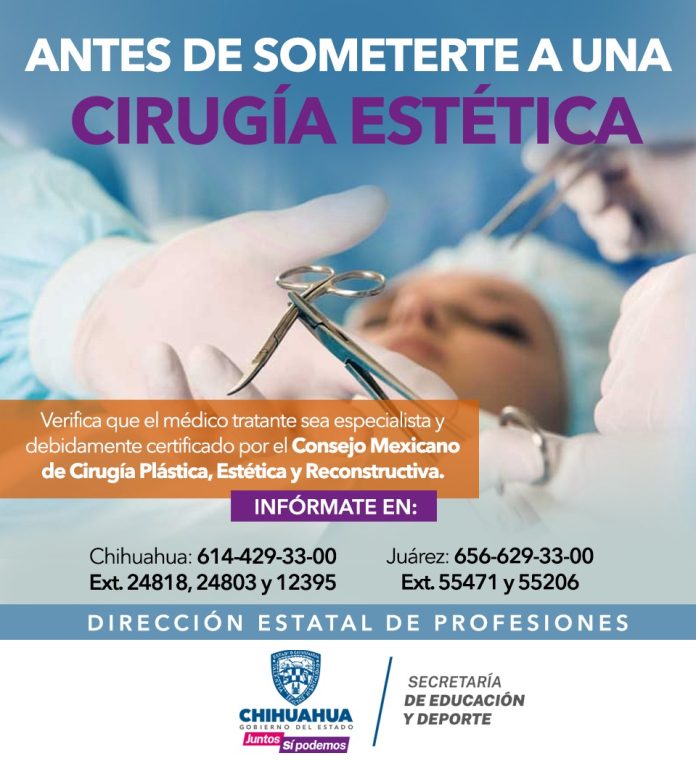 Chihuahua, Chih .– Con el fin de salvaguardar la integridad física de las y los ciudadanos que buscan realizarse alguna cirugía plástica, estética o reconstructiva, la Secretaría de Educación y Deporte (SEyD), les exhorta a verificar previamente en la Dirección Estatal de Profesiones, que el médico tratante sea especialista y se encuentre debidamente certificado por el Consejo Mexicano de Cirugía Plástica, Estética y Reconstructiva.