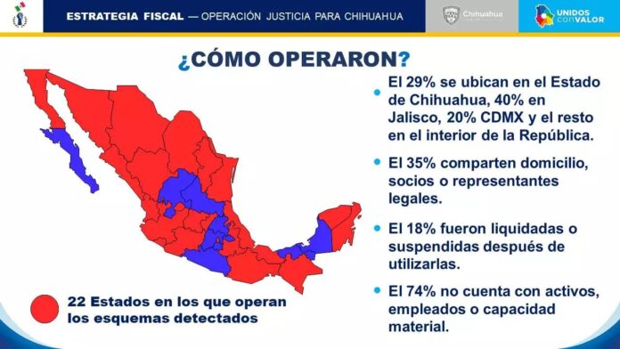 En el rastreo efectuado por la Secretaría de Hacienda, se determinó que las empresas fantasma operaron en 22 entidades de la República Mexicana: el 29 por ciento (%) en el estado de Chihuahua; 40% en Jalisco y el 20% en la Ciudad de México, el resto en otros estados.
