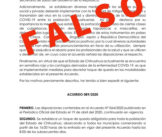 Chihuahua, Chih. – El secretario General de Gobierno, Luis Fernando Mesta Soulé, señaló que es totalmente falso el documento que circula en redes sociales y chats de Whatsapp, por el que supuestamente se declara “toque de queda” en toda la entidad.