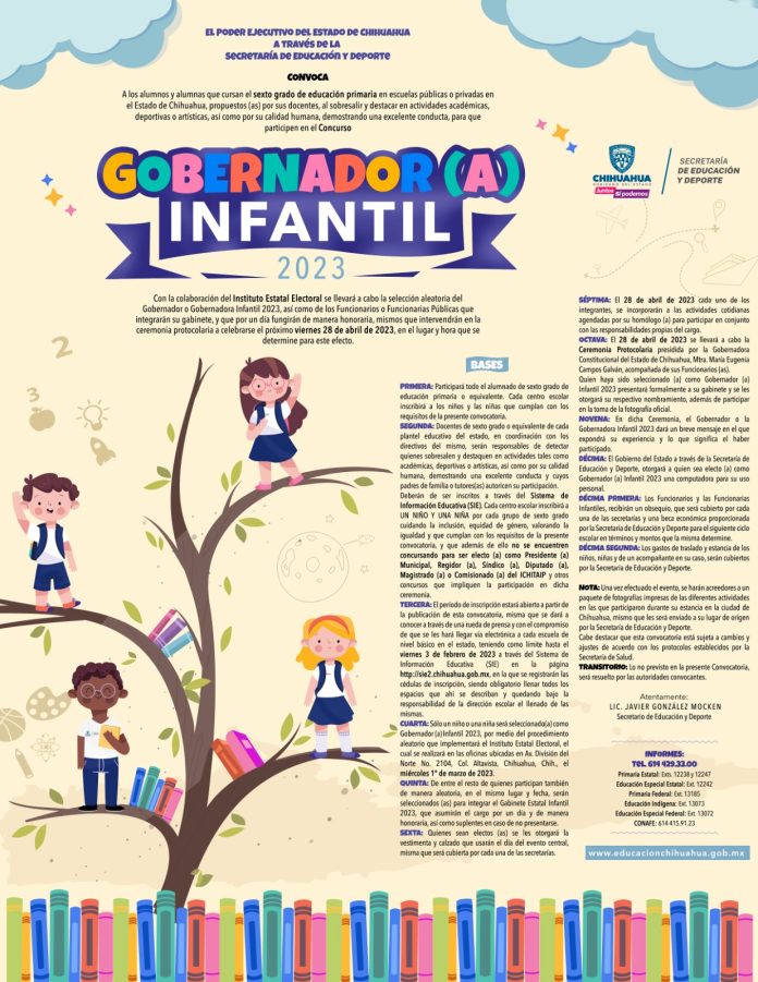 Se invita a la población en general a ingresar en el siguiente enlace: http://www.educacion.chihuahua.gob.mx/convocatorias-difusion/convocatorias-gobernador-infantil-diputado-diputada-infantil-magistratura para conocer mayor información sobre las convocatorias de los concursos.