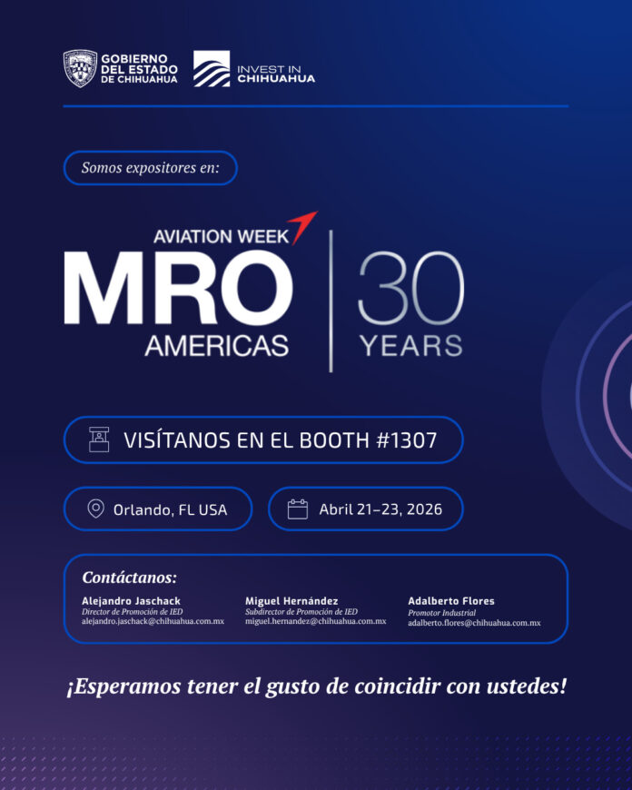 Ciudad de México (ADN/Staff) – El Gobierno del Estado de Chihuahua anunció su participación en MRO Americas 2026, el evento más relevante a nivel mundial en mantenimiento, reparación y overhaul aeronáutico, como parte de su estrategia para fortalecer la presencia internacional del sector aeroespacial.