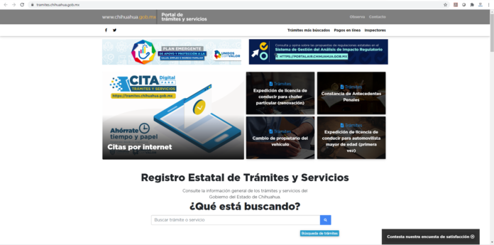 Se puede acceder a través de la liga tramites.chihuahua.gob.mx// <tramites.chihuahua.gob.mx/>, para obtener la información de los trámites y servicios que presta la Administración Pública del Estado de Chihuahua.