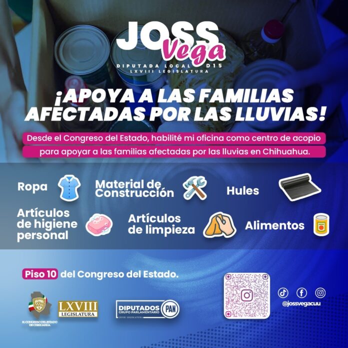 La diputada del Partido Acción Nacional (PAN), Joceline ‘Joss’ Vega, ha hecho un llamado a la ciudadanía para que se solidarice con quienes han sido afectados por las recientes lluvias en la capital del estado. A través de un comunicado, anunció que su oficina, ubicada en el piso 10 del Congreso del Estado, funcionará como un centro de acopio destinado a recolectar ayuda para los damnificados.