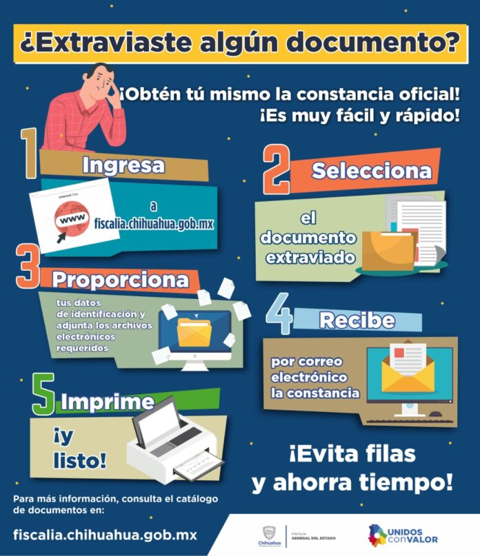 Chihuahua, Chih . – La Fiscalía General del Estado habilitó en la página oficial un apartado para que la ciudadanía obtenga la constancia que acredita el extravío de algún documento.