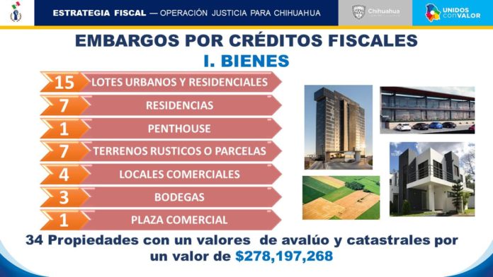 Chihuahua, Chih. – Embargos mediante créditos fiscales por un monto de 583.5 millones de pesos (mdp) en bienes muebles e inmuebles, además de marcas comerciales y acciones en empresas, son el resultado de la estrategia fiscal de la Operación Justicia para Chihuahua, a través de la Secretaría de Hacienda de Gobierno del Estado.