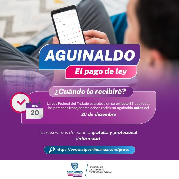 Chihuahua, Chih .- La Secretaría del Trabajo y Previsión Social (STPS) informa a las y los trabajadores de Chihuahua, que hoy 20 de diciembre de 2023 es el último día para recibir la prestación del aguinaldo, por lo que deberán percibir un mínimo de 15 días de sueldo por año laborado, o bien el monto proporcional al tiempo que se haya trabajado.