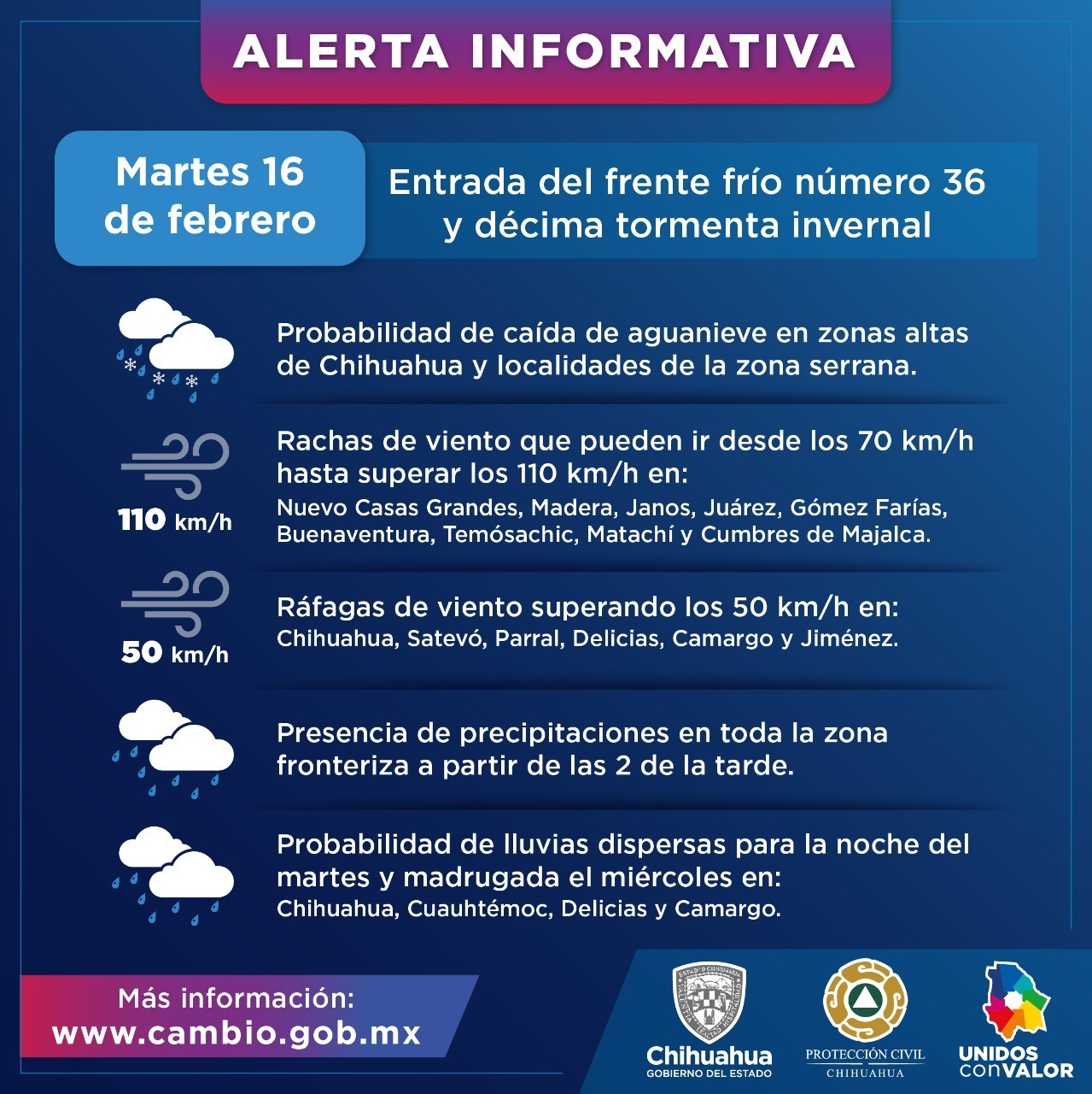 Chihuahua, Chih.- Durante la tarde y noche de este martes 16 de febrero se presentarán lluvias en Ciudad Juárez, debido al ingreso del Frente Frío 36 que viene acompañado de la Décima Tormenta Invernal, informó el meteorólogo de la Coordinación Estatal de Protección Civil (CEPC), Idelfonso Díaz.