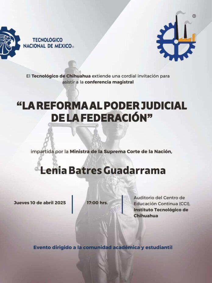 Chihuahua, Chih (ADN/Arturo Hernández) .- El Instituto Tecnológico de Chihuahua, presenta la conferencia magistral “La reforma al Poder Judicial de la Federación”, impartida por la Ministra de la Suprema Corte de Justicia de la Nación, Lenia Batres Guadarrama.