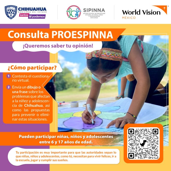 Chihuahua, Chih .- El Gobierno del Estado y la organización World Vision México, dieron a conocer el lanzamiento de la Consulta Estatal a Niñas, Niños y Adolescentes (NNA), que servirá como herramienta para el diseño del Plan de Protección Integral, que garantizará la defensa de sus derechos en Chihuahua.