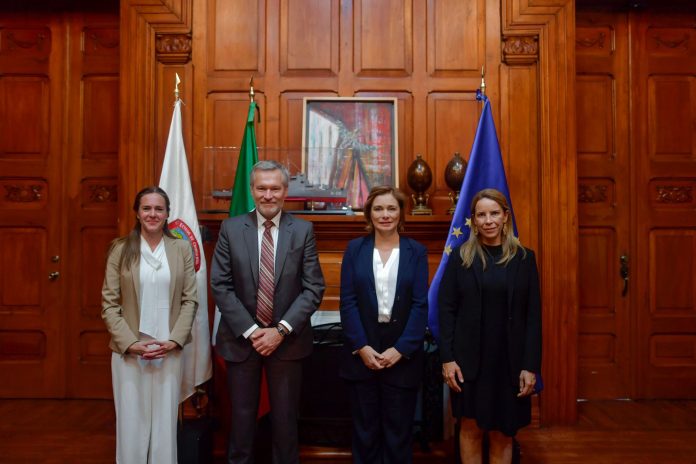 Se reunieron el embajador de la Unión Europea en México, Gautier Mignot, y la asesora comercial de la embajada de la Unión Europea en México, Annabell Boissonnade, con la Gobernadora del Estado María Eugenia Campos Galván, en el el marco de actividades del Foro México – Unión Europea sobre Economía Circular en el contexto de la recuperación económica post-COVID.