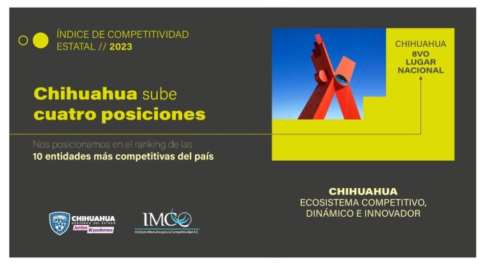 Chihuahua, Chih .- El estado de Chihuahua subió 4 posiciones en el Índice de Competitividad Estatal (ICE 2023), e ingresó al ranking de las 10 entidades más competitivas del país, según datos del Instituto Mexicano para la Competitividad A.C (IMCO).