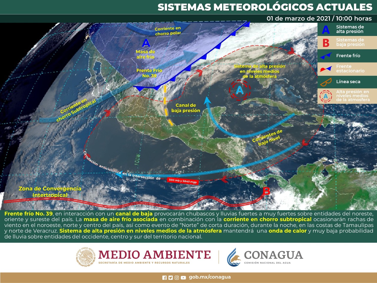 El jueves 4 ingresará el Frente Frío 40 y en interacción con la corriente en chorro favorecerá ambiente de muy frío a frío por la mañana y de cálido a caluroso por la tarde con un cielo mayormente nublado.