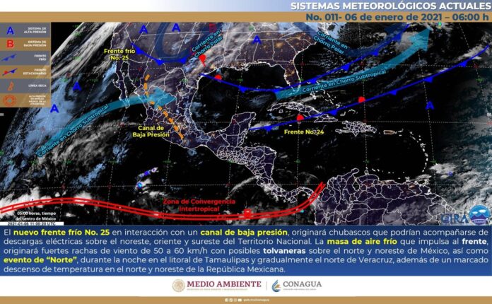 Para el jueves 7, el frente frío 25 favorecerá un ambiente de gélido a muy frío por la mañana y templado por la tarde, cielo parcialmente nublado, viento de 5 a 20 km/h, con ráfagas que pueden superar los 35 km/h en la zona occidente, como el municipio de Guerrero.
