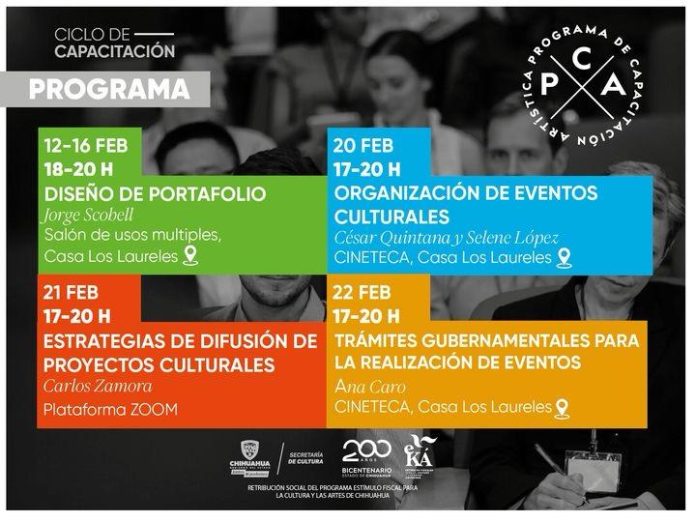 El martes 20 de febrero, en la Cineteca Chihuahua, se ofrecerá la capacitación “Organización de Eventos Culturales” por Selene López y Cesar Quintana. La asesoría estará diseñada para conocer los pasos, insumos, procedimientos y requerimientos básicos y técnicos para la producción de un evento escénico.