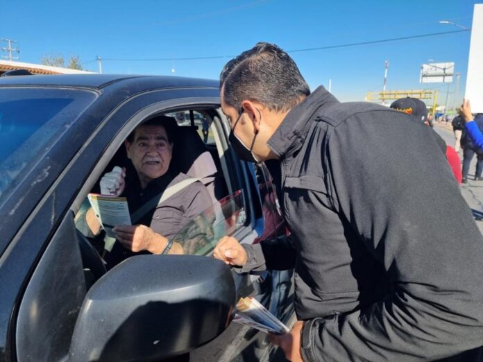 Mientras entregaba los volantes, enfatizó a las y los connacionales en utilizar los números telefónicos de emergencia 9-1-1 y 089, pero sobre todo el (614 4297343) línea directa para denunciar cualquier acto de corrupción por parte de las autoridades, durante su trayecto.