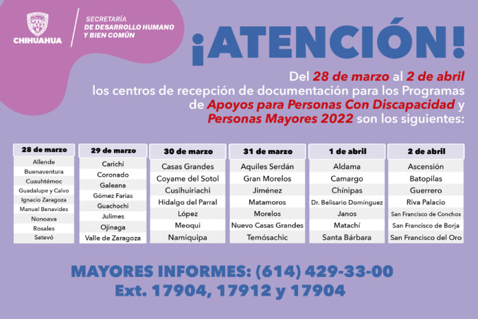 Chihuahua, Chih .- Gobierno del Estado, a través de la Secretaría de Desarrollo Humano y Bien Común iniciará el próximo lunes la recepción de documentos de los programas de Apoyos 2022 para Personas Mayores y para Personas con Discapacidad, en 45 municipios de la entidad.