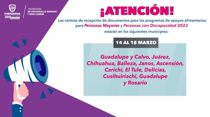 Chihuahua, Chih .- Gobierno del Estado, a través de la Secretaría de Desarrollo Humano y Bien Común (SDHyBC), informó que comenzará la recepción de documentos de las convocatorias para apoyos alimentarios a personas mayores o con alguna discapacidad.