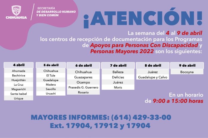 Chihuahua, Chih .- El Gobierno del Estado, a través de la Secretaría de Desarrollo Humano y Bien Común del Gobierno del Estado, continuará esta semana con la recepción de papelería para los Programas de Apoyos para Personas Mayores y Personas con Discapacidad 2022, en 23 municipios para cubrir en su totalidad la entidad.