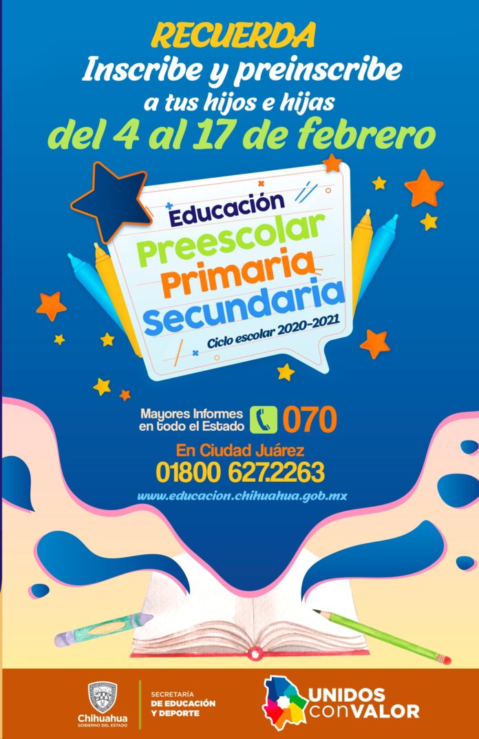 Chihuahua, Chih. – La Secretaría de Educación y Deporte (SEyD) llevará a cabo en el mes de febrero del presente año, la campaña de inscripción y preinscripción en educación básica, para el ciclo escolar 2021-2022.