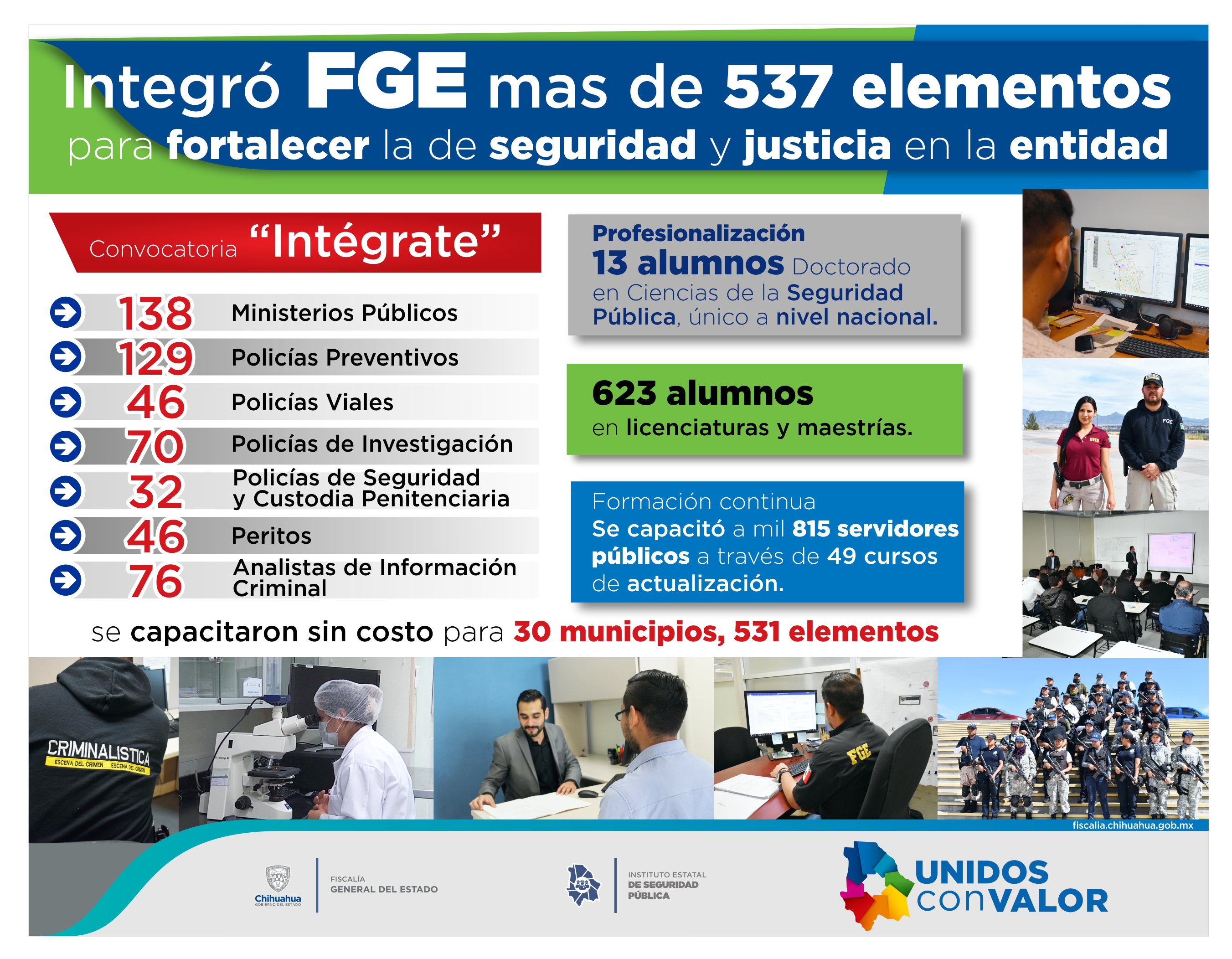La Fiscalía General del Estado (FGE) de Chihuahua informó que durante 2019 se sumaron 537 hombres y mujeres a los cuerpos operativos, como resultado de la convocatoria Intégrate hecha a través del Instituto Estatal de Seguridad Pública (IESP).