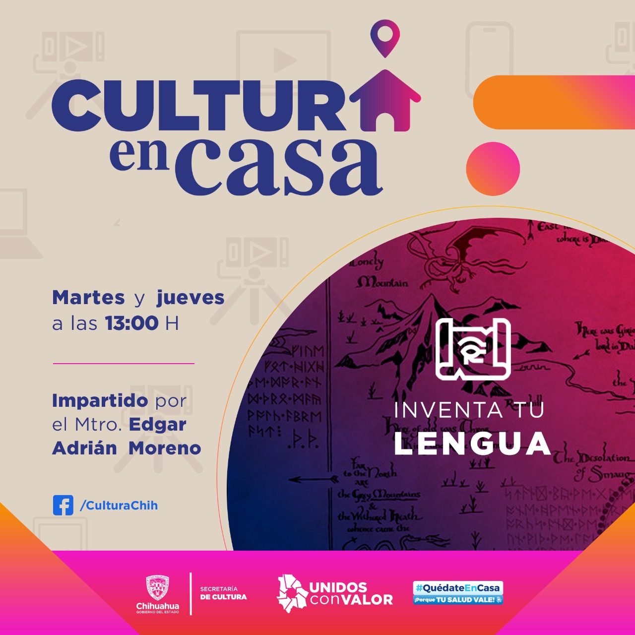 La Secretaría de Cultura de Chihuahua, a través del Departamento de Culturas Étnicas y Diversidad realizará el taller ¡Inventa tu Lengua!, que se transmitirá de manera virtual en la página de la de Facebook de dicha dependencia, los martes y jueves a la una de la tarde, a partir del 14 de abril y hasta el 28 de mayo.