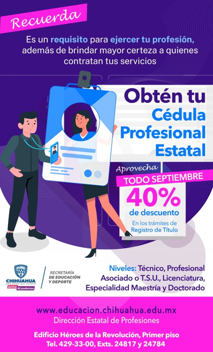 Chihuahua, Chih .- La Secretaría de Educación invita a los profesionistas y recién egresados de las instituciones de educación técnica profesional y de nivel superior a aprovechar los últimos días de descuento del 40 por ciento en el trámite de la Cédula Profesional Estatal.