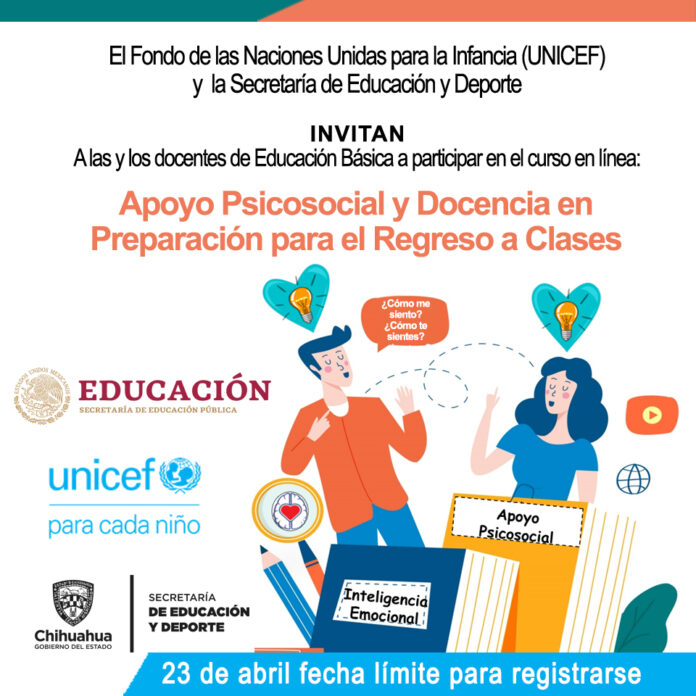 Chihuahua, Chih.- La Secretaría de Educación y Deporte (SEyD) del Gobierno de Chihuahua, la Secretaría de Educación Pública (SEP) y el Fondo de las Naciones Unida para la Infancia (Unicef), invitan a maestras y maestros de Educación Básica a participar en el curso “Apoyo Psicosocial y Docencia en Preparación para el Regreso a Clases”.