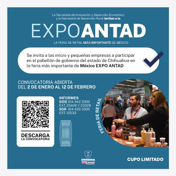 Chihuahua, Chih .- Con el objetivo de contribuir al crecimiento, desarrollo y competitividad de las MiPymes del estado, la Secretaría de Innovación y Desarrollo Económico (SIDE) y la Secretaría de Desarrollo Rural (SDR), invitan a las micro, pequeñas y medianas empresas a participar en la Expo ANTAD México 2024, que se llevará a cabo del 12 al 14 de marzo de 2024 en Expo Guadalajara.
