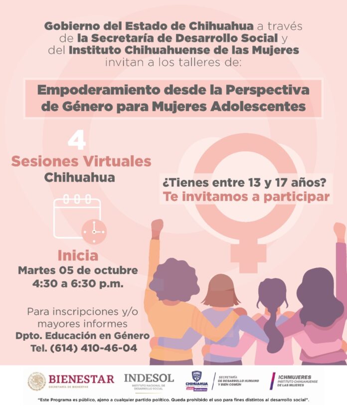 El Instituto Chihuahuense de las Mujeres (ICHMUJERES) invita a participar en el taller “Empoderamiento desde la Perspectiva de Género para Mujeres Adolescentes”, dirigido a jóvenes de entre 13 y 17 años de los municipios de Chihuahua, Nuevo Casas Grandes, Ojinaga y Madera.