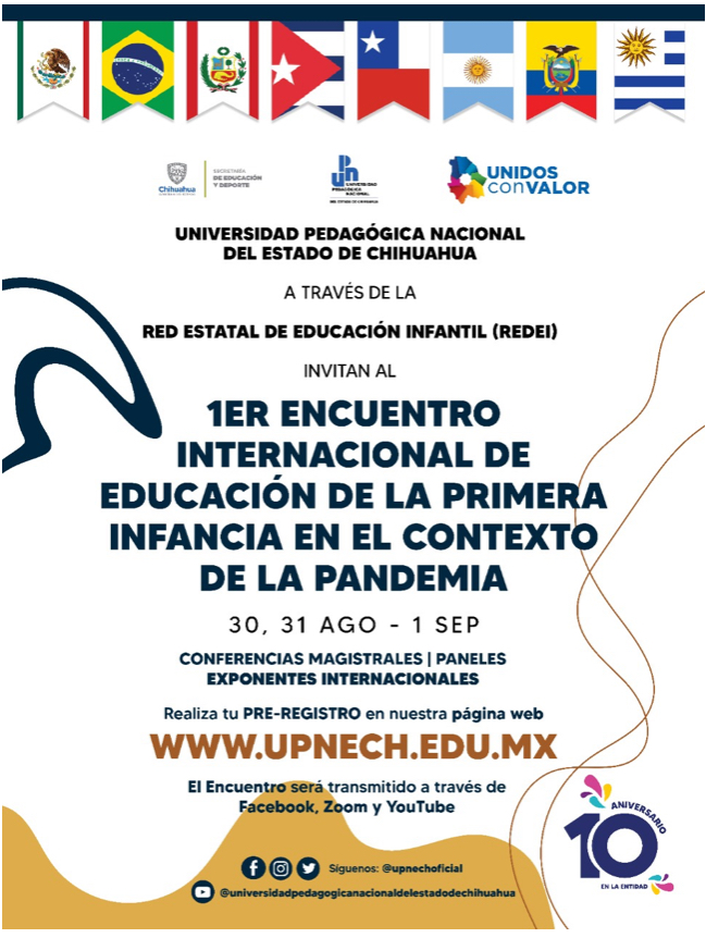 Chihuahua, Chih.- En el marco de las actividades por el 10° aniversario, la Universidad Pedagógica Nacional del Estado de Chihuahua (Upnech), en coordinación con la Red Estatal de Educación Infantil (Redei), organizó el 1er Encuentro Internacional de Educación de la Primera Infancia en el Contexto de la Pandemia.