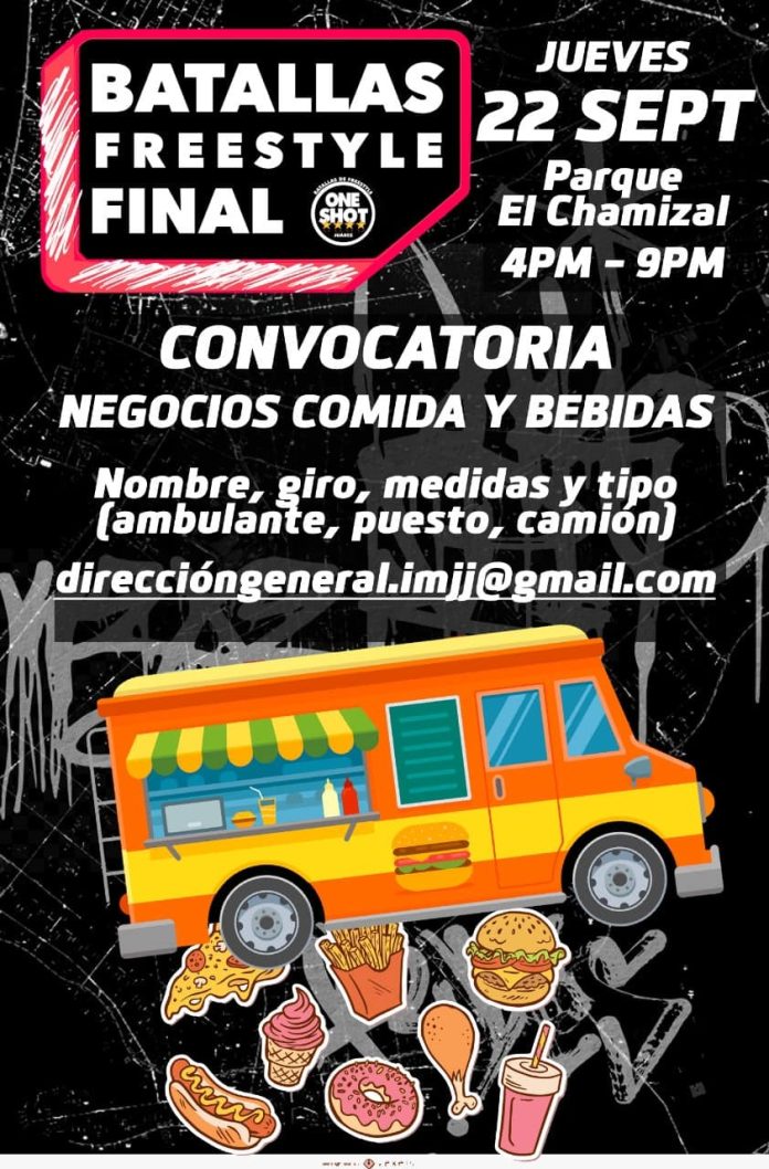 Ciudad Juárez, Chih .- El Instituto Municipal de la Juventud Juarense (IMJJ) invita a los propietarios de restaurantes y puestos de comida para que participen en el concurso final de Batallas de Freestyle, evento que se efectuará el próximo jueves 22 de septiembre en el parque El Chamizal.