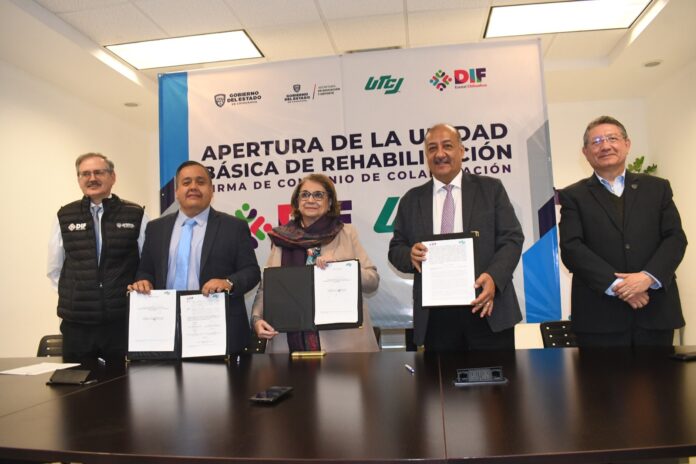 El rector de la UTCJ, Carlos Ernesto Ortiz Villegas, y la presidenta del DIF estatal, María Eugenia Galván Antillón, firmaron un convenio de colaboración para operar el centro de rehabilitación.