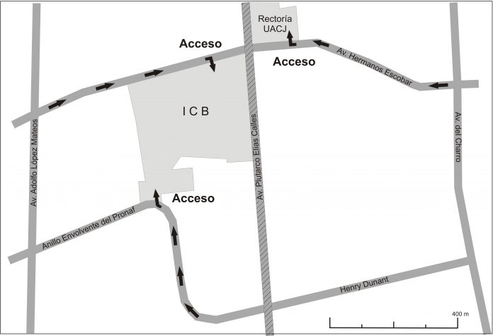 – Para entrar al Instituto de Ciencias Biomédicas sólo se dará acceso por el Centro Cultural Paso del Norte y por la Hermanos Escobar (en este caso, debe tomarse esta vía de poniente a oriente).