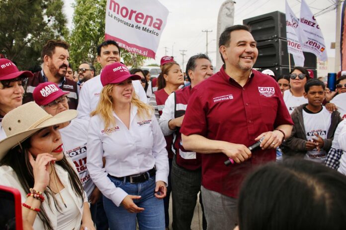 Ciudad Juárez, Chih. (ADN/Staff) – En un marcado gesto de unidad y compromiso político, Ana Carmen Estrada, candidata a Síndica Municipal, acompañó al candidato a la alcaldía por la coalición MORENA-PT, Cruz Pérez Cuéllar, en un recorrido por importantes intersecciones de Ciudad Juárez. Este acto simbolizó el tercer día de una campaña que busca consolidar la visión de ambos candidatos para el futuro de la ciudad.