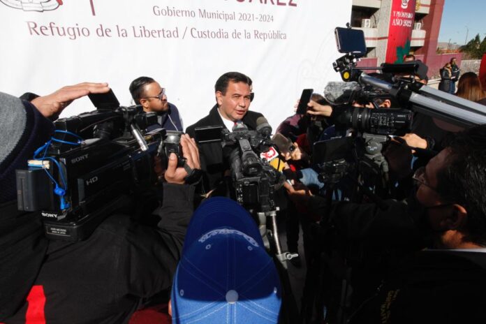 Ciudad Juárez, Chih .- Tras encabezar un acto cívico en la explanada de la Unidad Administrativa Lic. Benito Juárez, sede de la Presidencia Municipal, el alcalde se encaminó a los contribuyentes que en ese momento hacían fila para pasar a la Dirección de Ingresos a pagar sus impuestos.
