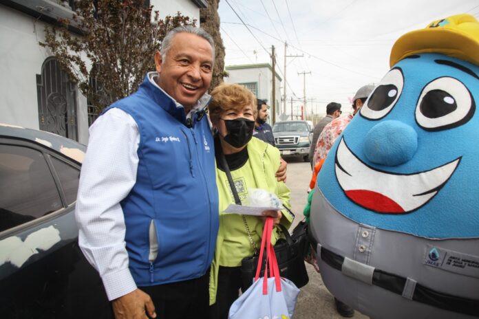 Entre los vecinos que se acercaron a agradecer al director de la J+ por los trabajos de cambio de drenaje realizados en Los Parques, estuvo la señora Ofelia Esparza, quien, además, recibió como obsequio un sapito y una regadera ahorradora para su vivienda.