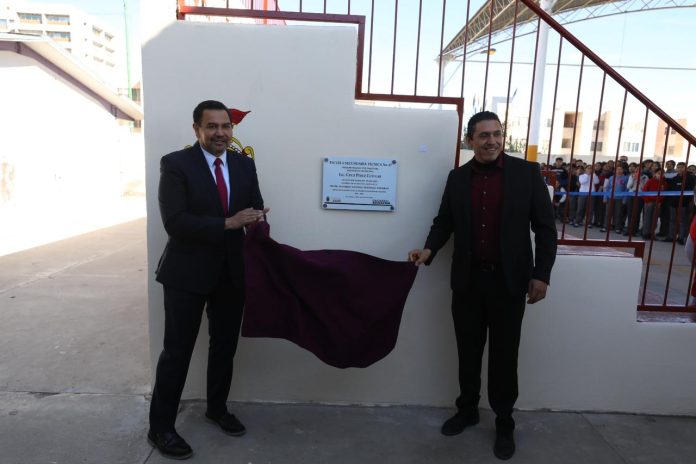 Ciudad Juárez, Chih .- El Presidente Municipal, Cruz Pérez Cuéllar, hizo entrega de las obras de rehabilitación en la Escuela Secundaria Técnica 47, ubicada en Infonavit Casas Grandes.