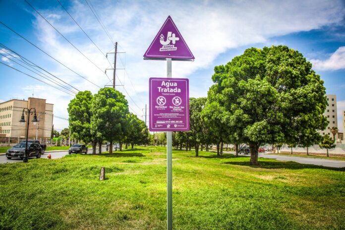 Con la finalidad de evitar afectaciones en la salud pública, la Junta de Agua y Saneamiento de Juárez instala más señalamientos de línea morada en zonas regadas con agua tratada.