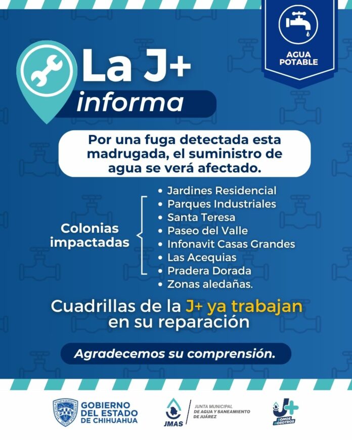 Debido a una fuga reportada la madrugada de este viernes en el fraccionamiento Jardines Residencial, la J+ informa que habrá afectación en el servicio de agua potable en este sector.