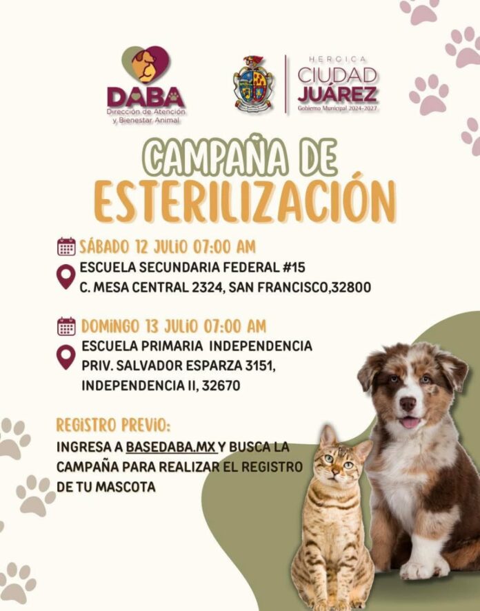 Si tienes una mascota en casa y aún no la has esterilizado, la Dirección de Atención y Bienestar Animal (DABA) invita a la comunidad para que aproveche la campaña de esterilización que tendrá lugar este sábado 12 y domingo 13 de julio, dio a conocer la titular de la dependencia, Alma Arredondo Salinas.