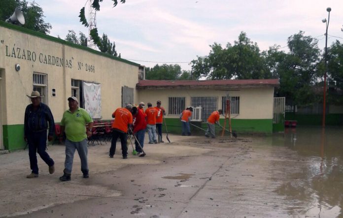 Señaló que en la medida de lo posible se seguirá apoyando, y por ello con maquinaria pesada y herramientas manuales se acudió hoy hasta la Escuela Primaria Lázaro Cárdenas 2466, del poblado de San Isidro, para retirar agua y lodo que inundaron las instalaciones.