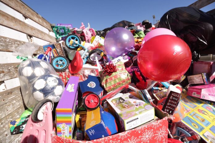 Ciudad Juárez, Chih. – Los regalos llegaron en un vehículo que se estacionó a la entrada del taller de juguetes, donde fueron colocados los triciclos, balones, muñecas, carros, peluches, legos y kit de belleza para niñas, entre otros juguetes, los cuales fueron sanitizados por los bomberos.