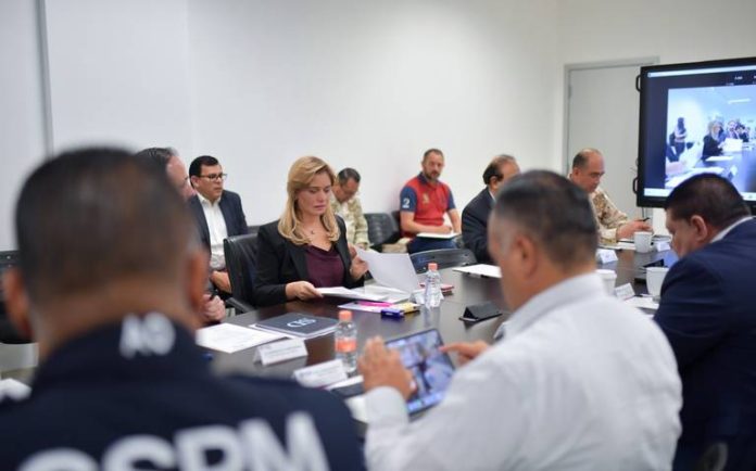 Maru Campos, gobernadora del estado, preside la reunión con la presencia de los jefes policiacos de las tres esferas de gobierno, y de la autoridad municipal.