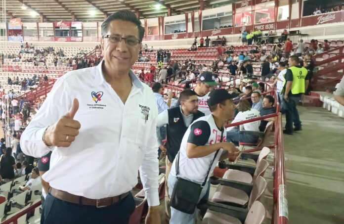 **Ciudad Juárez, Chih. (ADN/Staff) -** Rogelio Loya Luna, candidato a la presidencia municipal, asistió al estadio Juárez para presenciar el inicio de la serie entre Madera y Juárez, durante el último día de campañas. Loya estuvo acompañado por su familia y su equipo de campaña.