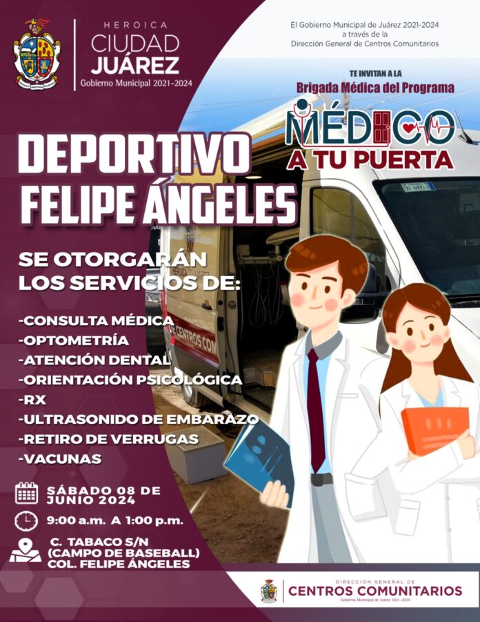 La Dirección General de Centros Comunitarios invita a los residentes de la colonia Felipe Ángeles y áreas circunvecinas a la Brigada Médica del Programa Médico a tu Puerta.