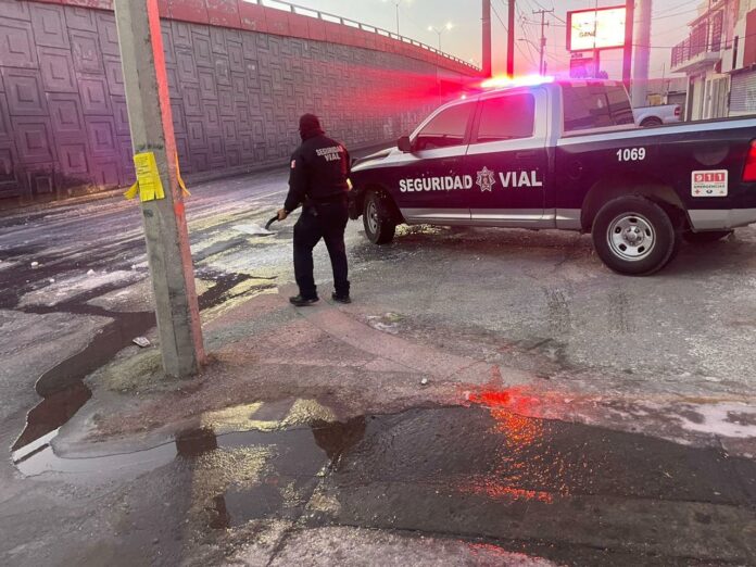 Como parte de las labores preventivas que realiza la Coordinación General de Seguridad Vial, durante los patrullajes que realizan los agentes esparcieron sal y arena en vialidades que representaban algún peligro para el tránsito, debido a la cristalización que se presentó derivado de las bajas temperaturas.