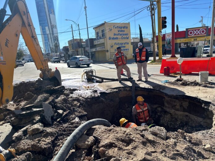 Ciudad Juárez, Chih. (ADN/Staff) – La Junta de Agua y Saneamiento de Juárez (J+) realiza trabajos de reparación por una fuga registrada en la red general de agua potable en la Zona Centro, lo que provocó afectaciones temporales en el suministro de varias colonias cercanas.