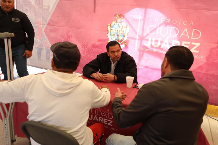 Ciudad Juárez, Chih .- Acompañado de su gabinete, el edil se colocó en una mesa y habló con cada una de las personas que solicitaron una audiencia, por lo que luego de dialogar con ellas las canalizó con los directores a fin de que las atendieran y les resolvieran los conflictos.