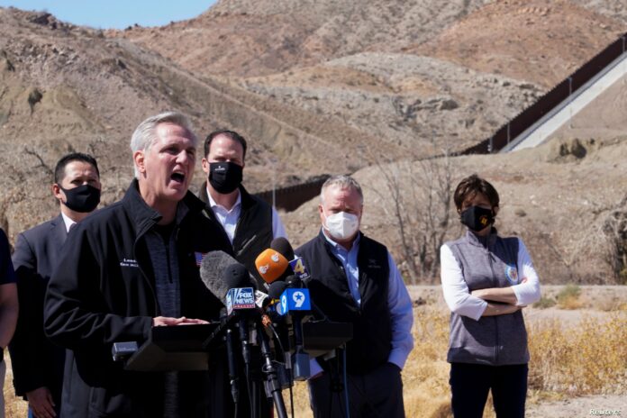 El líder de la minoría de la Cámara de Representantes, Kevin McCarthy, llevó a un grupo de legisladores republicanos a la frontera el lunes para condenar las políticas del presidente demócrata Joe Biden que, según McCarthy, han abierto la frontera a la inmigración ilegal sin restricciones.