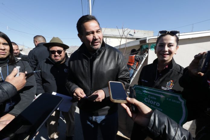 Ciudad Juárez, Chih .- El alcalde inició su recorrido en la intersección de las calles Cloro y Gardenias, donde estuvo acompañado por la directora general de Desarrollo Urbano, Claudia Morales Medina y la coordinadora de Asesores, Daniela González Lara, entre otros funcionarios.